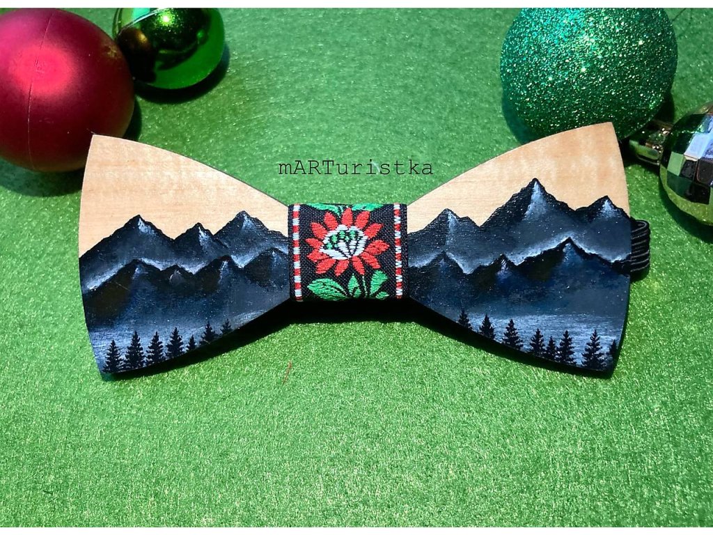 Originálny, ručne maľovaný drevený motýlik s milovanými horami.. :) Maľovaný je akrylovými farbami, povrch upravený ochranným lakom. Veľkosť gumičky je nastaviteľná.