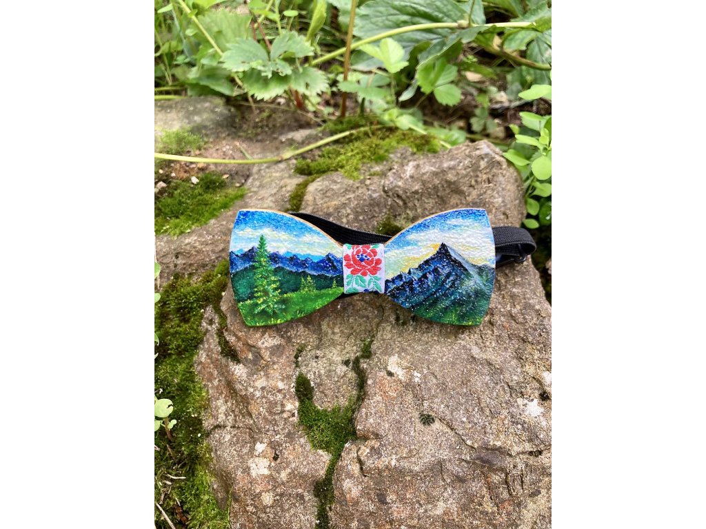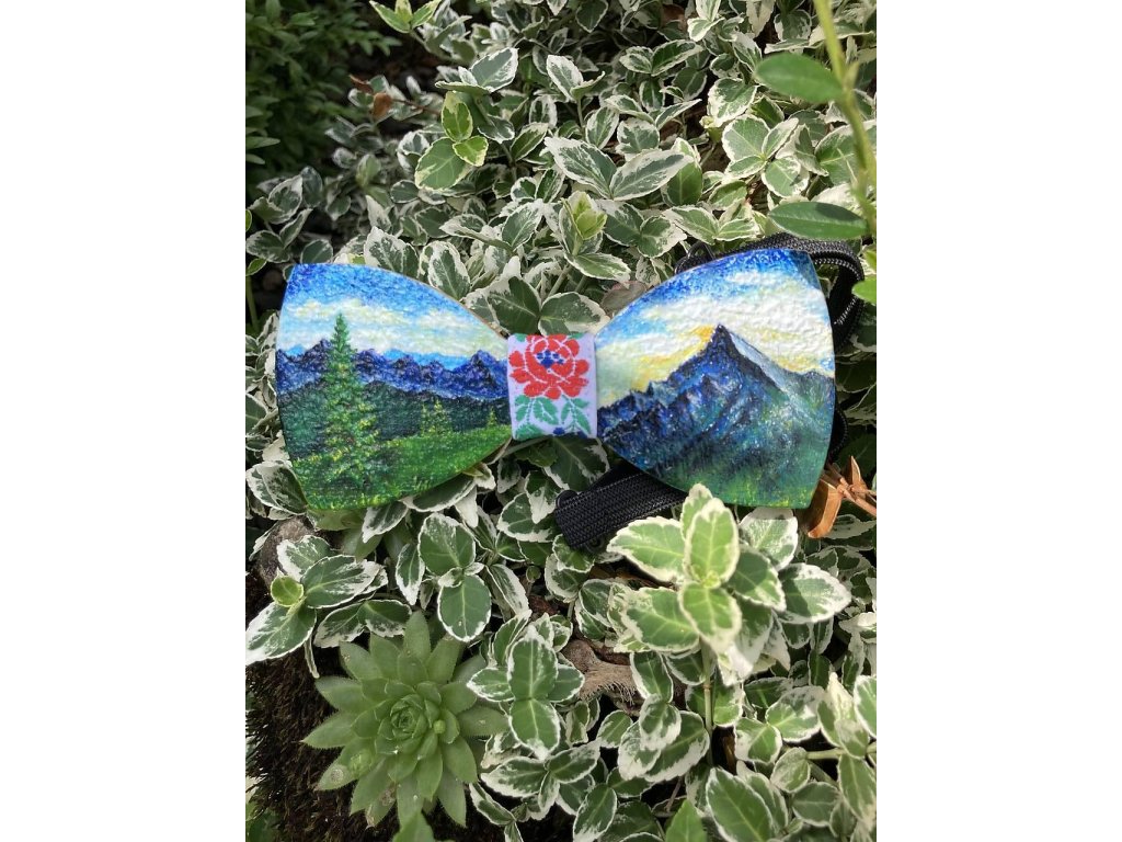 Originálny, ručne maľovaný motýlik s horami. Maľovaný je akrylovými farbami, povrch motýlika je ošetrený ochranným lakom, veľkosť gumičky je nastaviteľná.