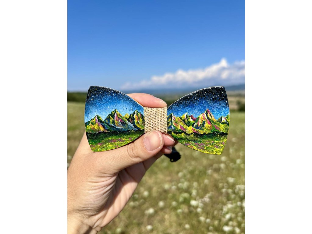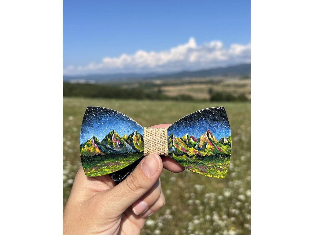 Originálny, ručne maľovaný drevený motýlik s milovanými horami. Maľovaný akrylovými farbami, povrch motýlika je ošetrený ochranným lakom, veľkosť gumičky je nastaviteľná.