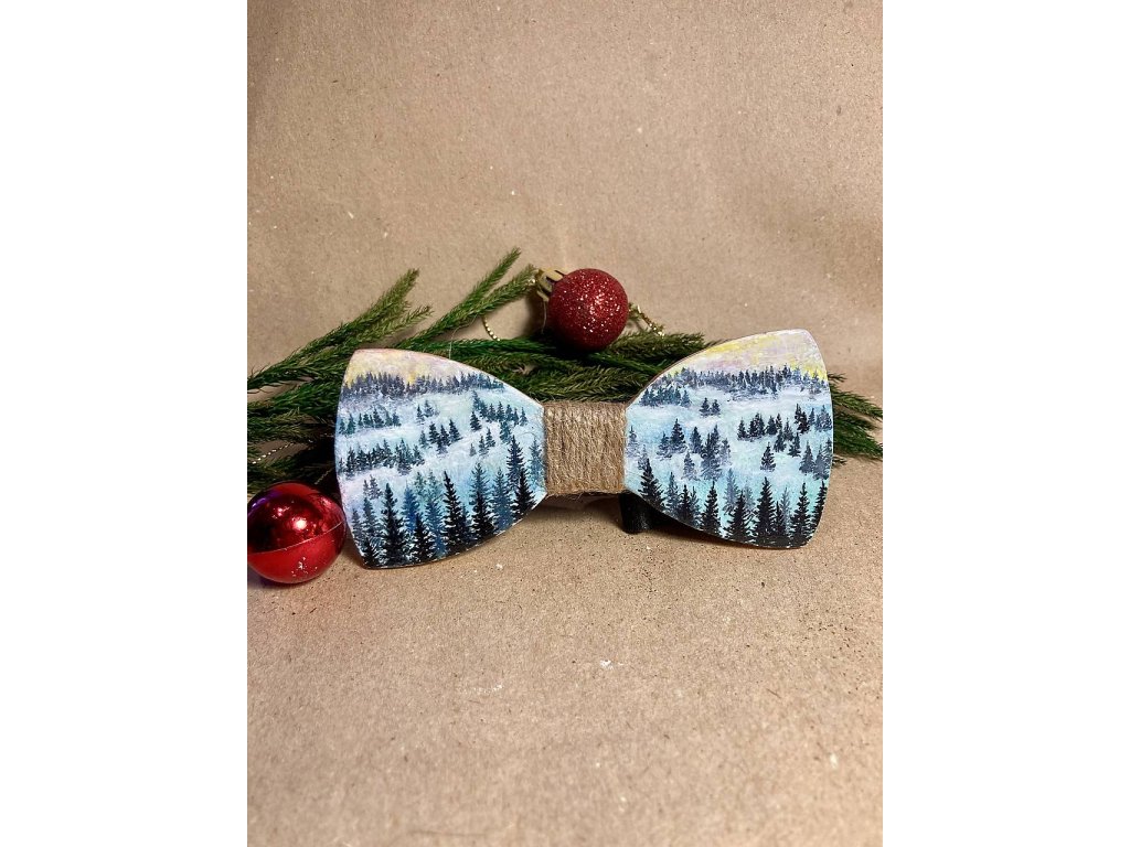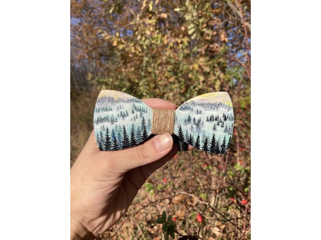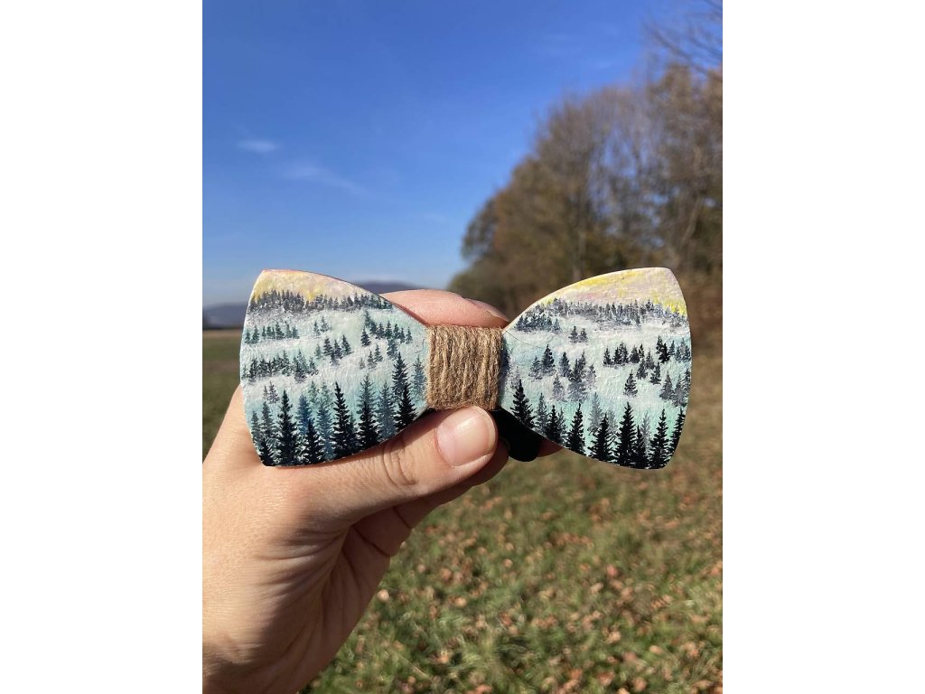 Drevený, ručne maľovaný originálny motýlik pre všetkých milovníkov hôr. Maľovaný je akrylovými farbami, povrch ošetrený ochranným lakom. Veľkosť gumičky je nastaviteľná.