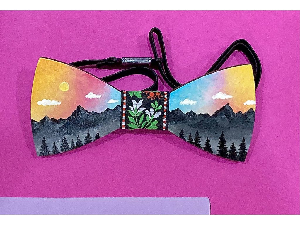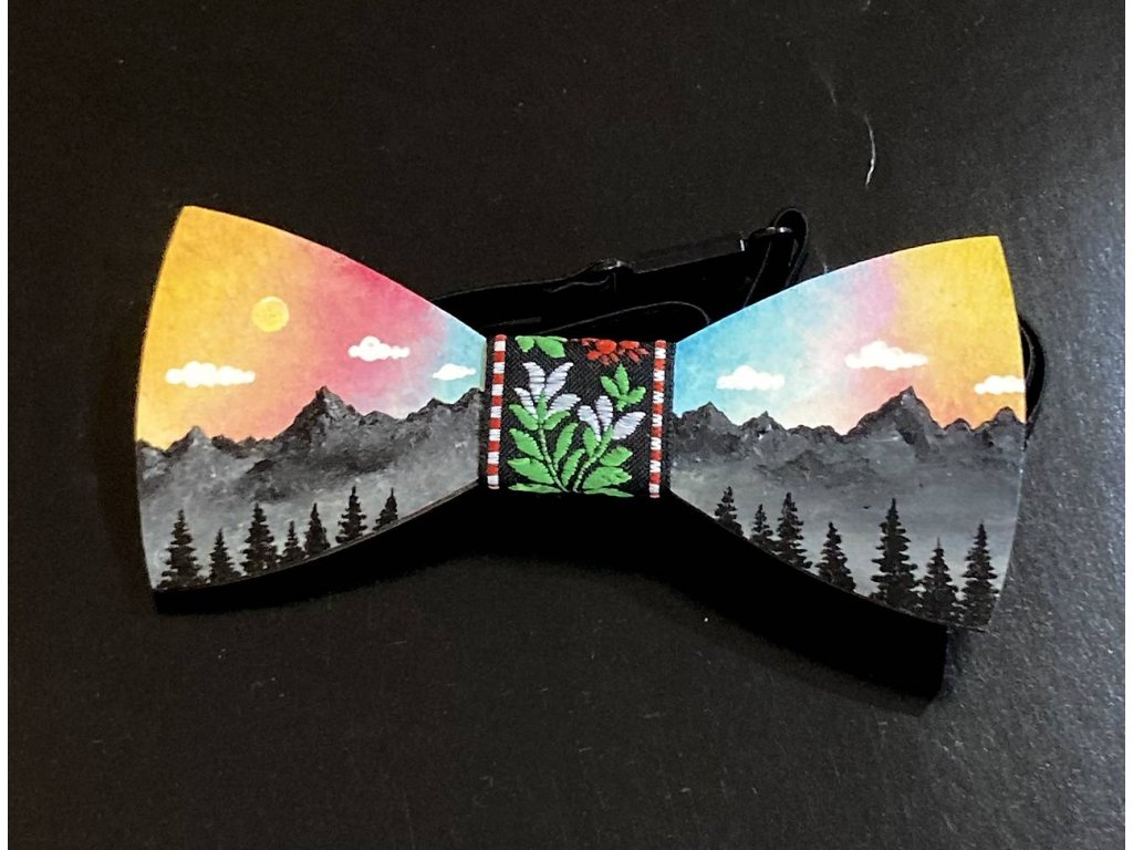 Originálny, ručne maľovaný drevený motýlik s milovanými horami.. :) Maľovaný je akrylovými farbami, povrch upravený ochranným lakom. Veľkosť gumičky je nastaviteľná.