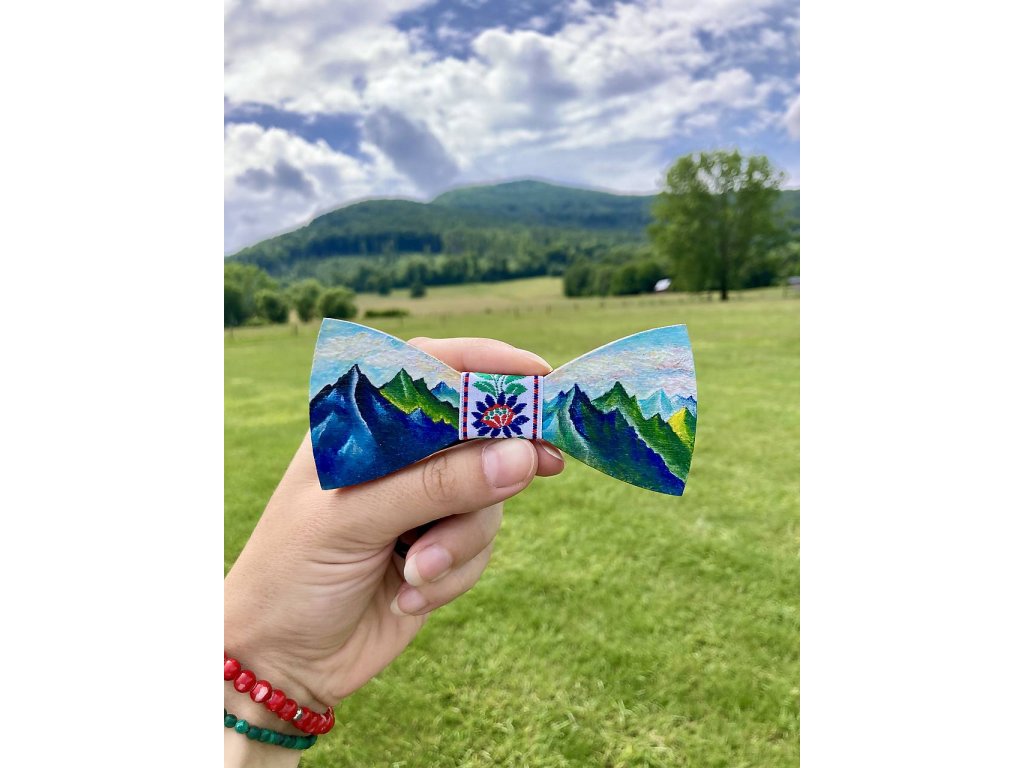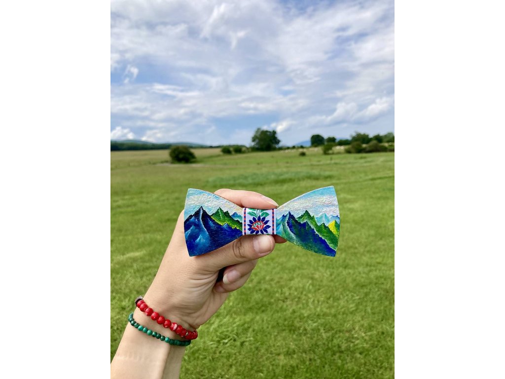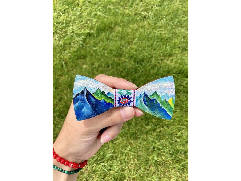 Drevený maľovaný motýlik s milovanými horami.. Maľovaný je akrylovými farbami, povrch upravený ochranným lakom. Veľkosť gumičky je nastaviteľná.