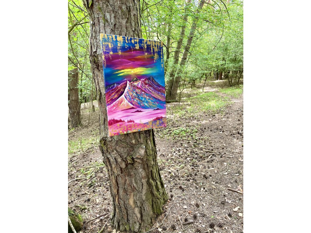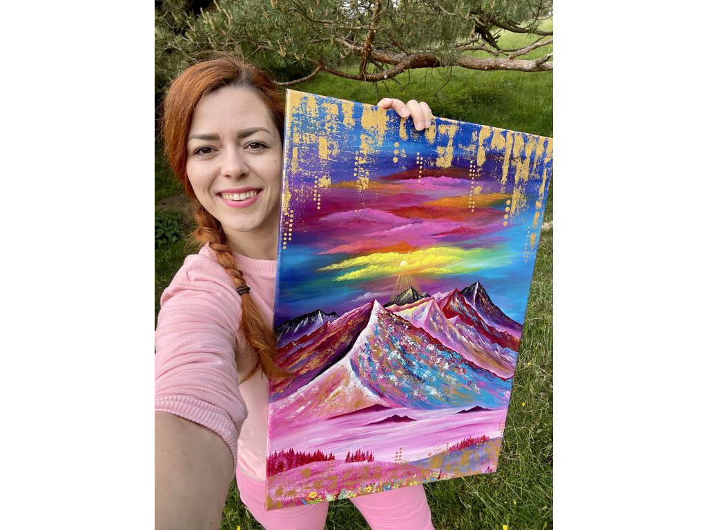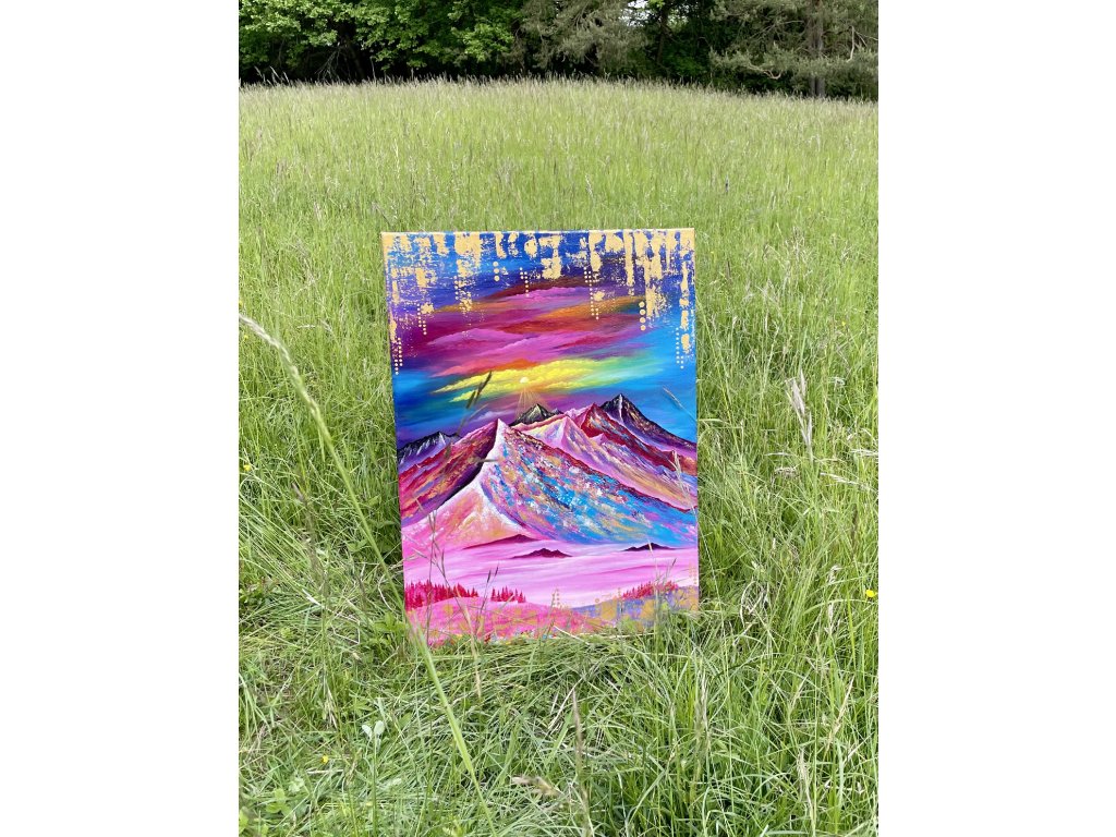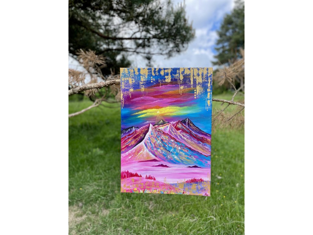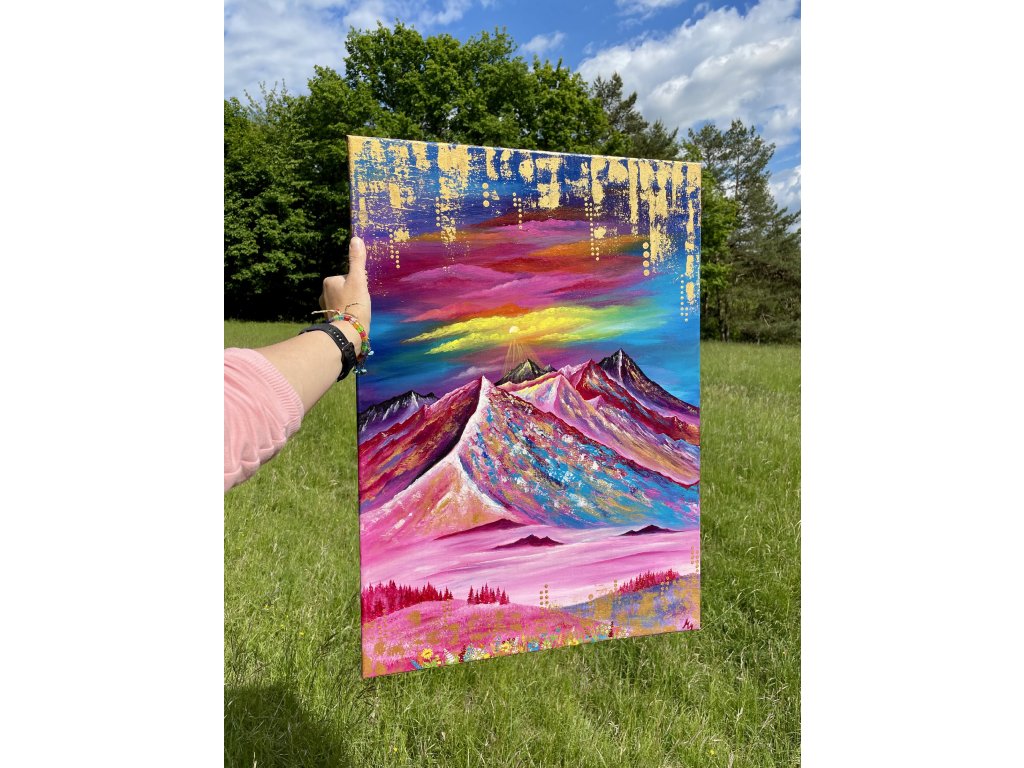 Originálna pestrofarebná maľba na plátne s milovanými horami. Tento pestrofarebný kúsok rozžiari každú miestnosť. Obraz je maľovaný akrylovými farbami, povrch je ošetrený ochranným lakom. Rozmer obrazu je 70x50 cm. Na zadnej strane rámu je kovová úchytka na zavesenie.