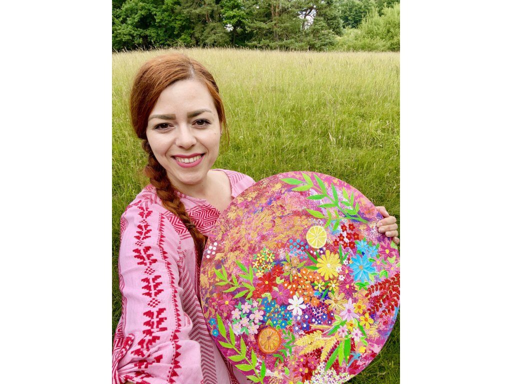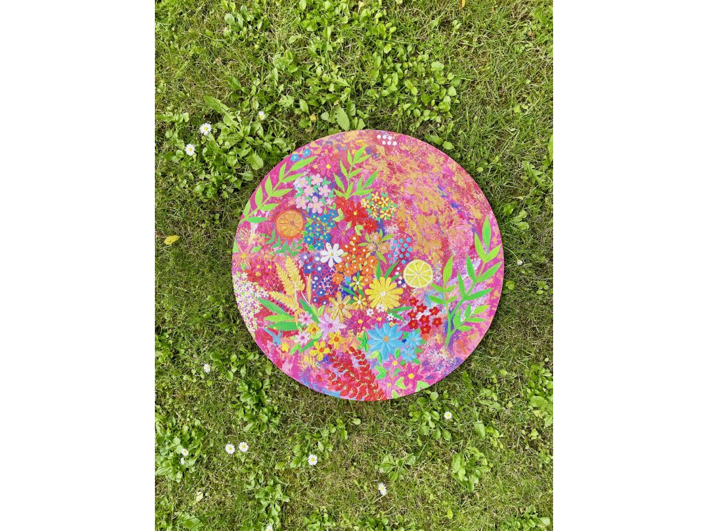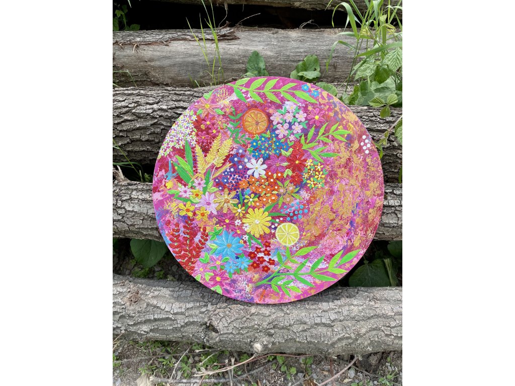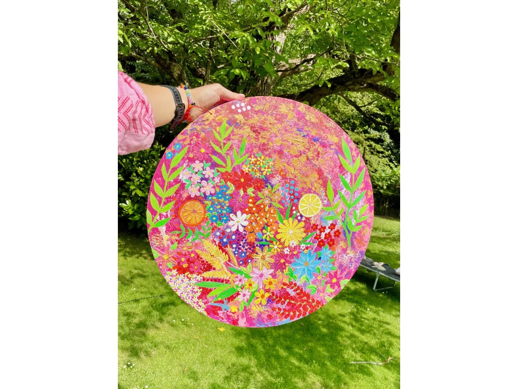 Vôňa leta. Táto pestrofarebná maľba rozžiari každú miestnosť. Tak ak hľadáš kúsok, ktorý ti pripomenie leto aj počas sychravých dní, tento obraz je ten pravý. Maľba je ozvláštnená maslovou pastou, ktorá vytvára jemný 3D efekt. Priemer obrazu je 50 cm, povrch je ošetrený ochranným lakom. Na zadnej strane je upevnená kovová úchytka na zavesenie.